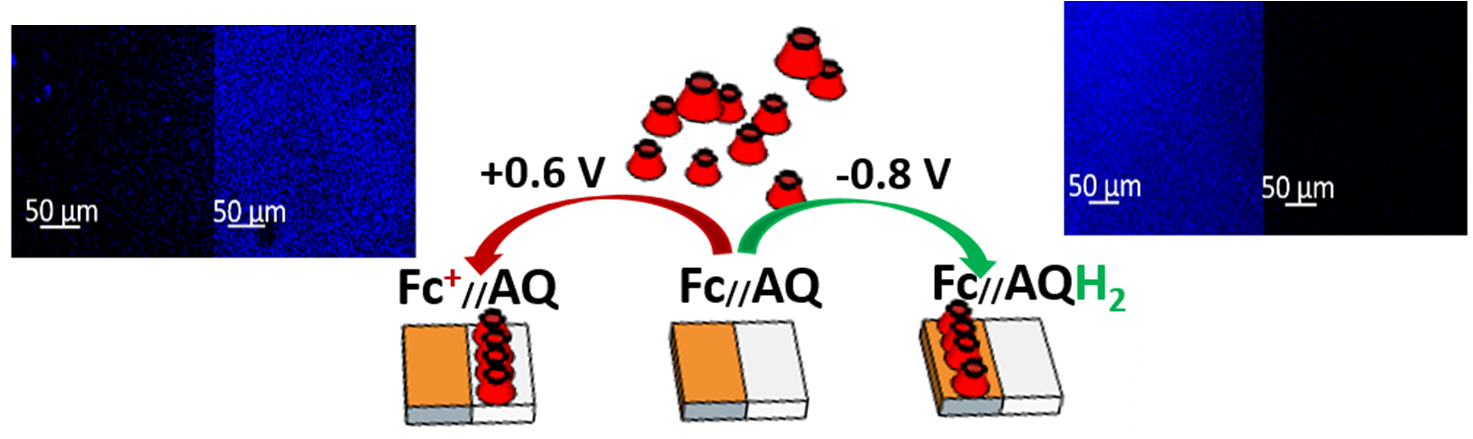 Electrochemically driven host-guest interactions on patterned donor/acceptor self-assembled monolayers